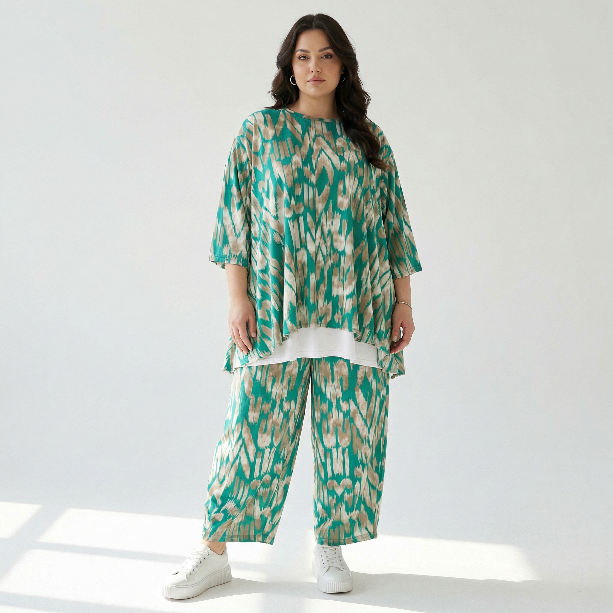 Entdecke das A-Form Shirt von AKH Fashion – ein Must-Have für deinen Kleiderschrank! In erfrischendem Mint-Beige und mit grafischem Muster begeistert es durch seine ausgefallene, zeitlose Lagenlook-Mode. Hergestellt aus leichtem, knitterfreien Slinky-Material (55% Viskose, 40% Polyester, 5% Elasthan) fühlt es sich weich und luftig an. Der Rundhalsausschnitt und die 3/4-Ärmel machen es perfekt für den Frühling und Sommer. Trage es leger und oversized für einen stilvollen Look!
